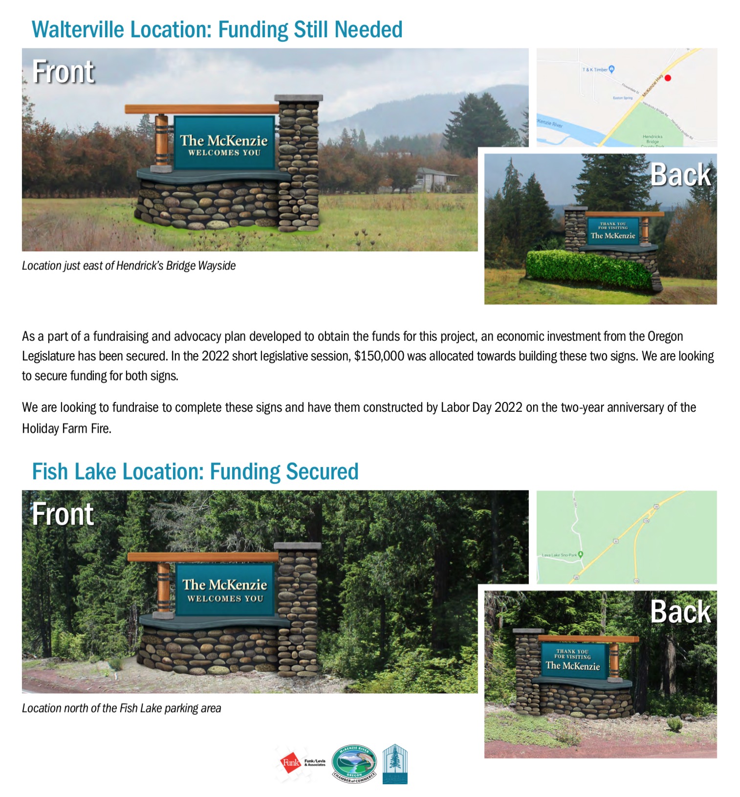 In May 2022 working with the McKenzie River Chamber of Commerce Tourism Committee, the McKenzie Community Partnership secured $150,000 for the gateway signs project. We will keep working to realize the project fully as well as focusing on other vital economic projects to ensure a healthy recovery for local businesses.